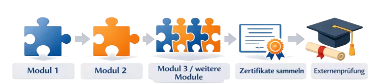 Module sind flexibel kombinierbar, auch einzelende Module sind buchbar. Die Externenprüfung zur Erlangung des anerkannten Berufsabschlusses ist optional.